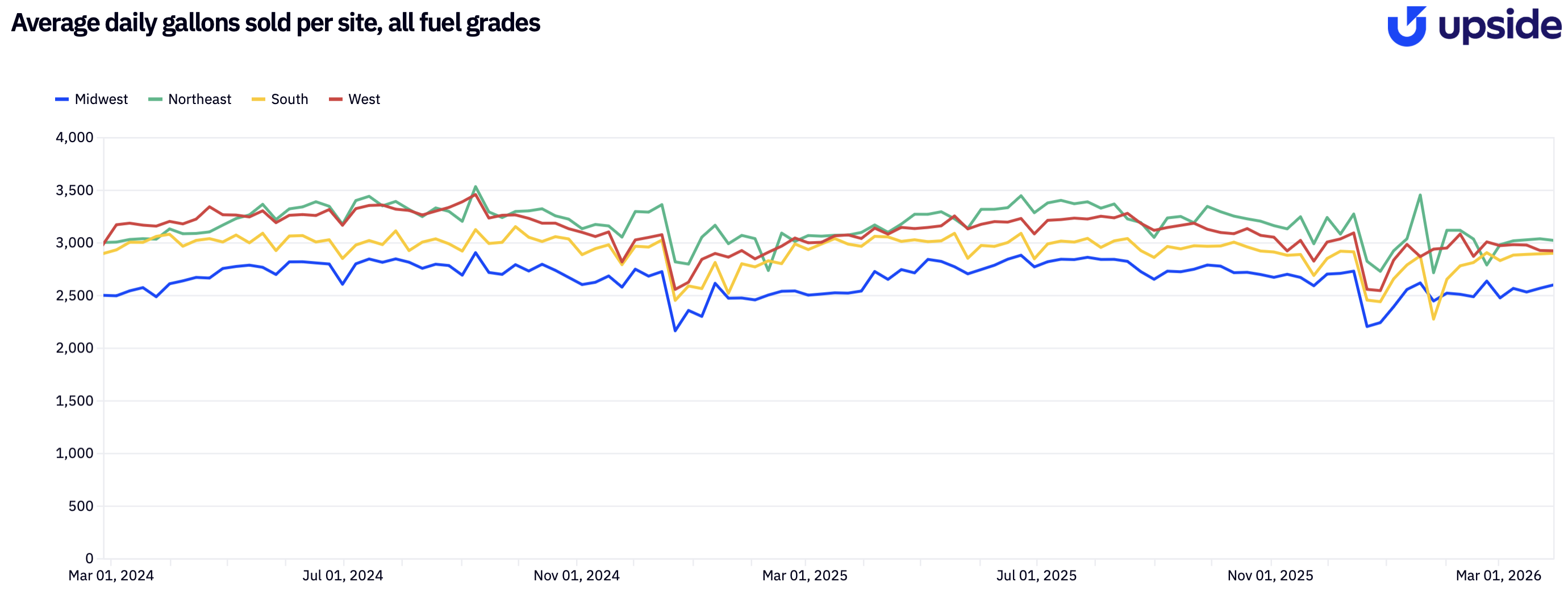 What a month for fuel. War in the Middle East has created a monumental supply problem, which has sent prices for oil, gasoline, and diesel skyrocketing. Though you might think transactions would be down due to the high prices, we actually notice that they're up. The reason is because drivers are hitting the pump more often for smaller fill-ups — when they only need a quarter or half a tank, for example. That's not the only change in behavior that we've noticed; premium and midgrade buyers are reducing the sting of big totals by trading down to regular gas. Get our full look at the impact of war on the fuel and convenience industry here.